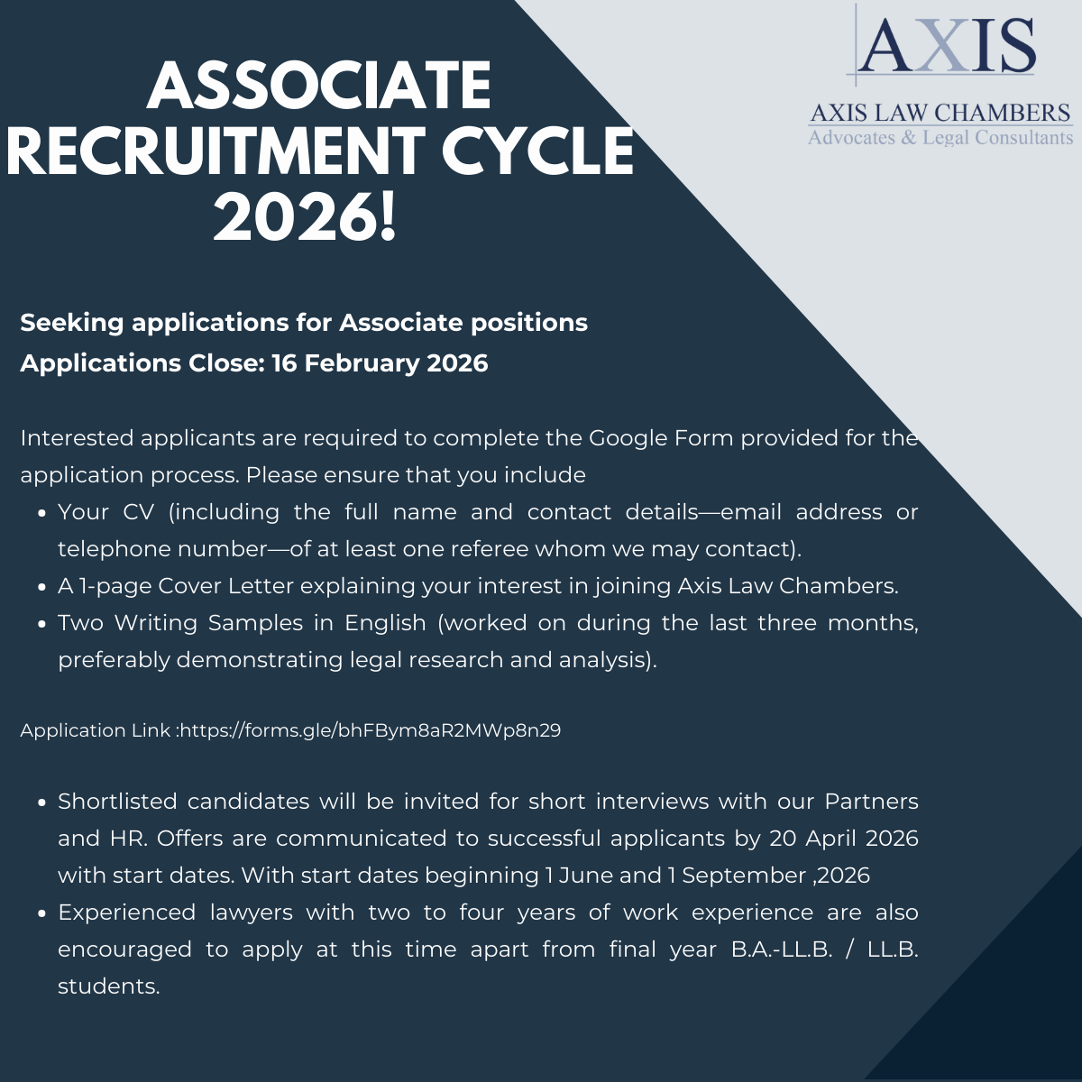 Applications are now open for our 2026 annual recruitment drive. Candidates should have excellent academic credentials and a passion for commercial law.